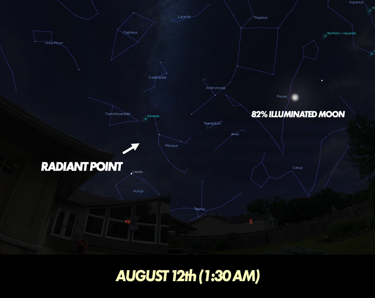 - Find the location: An unobstructed view of the northeastern sky and overhead is ideal. Locate the Perseus constellation; the longest trails are visible at 90° to the radiant.